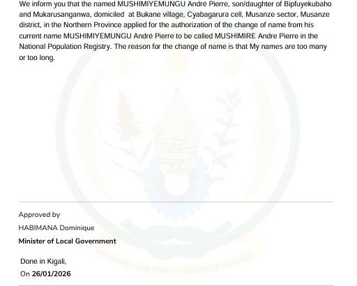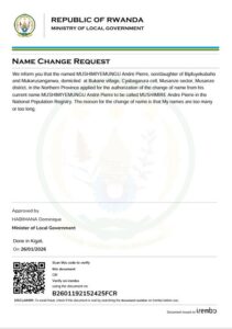 We inform you that the named MUSHIMIYEMUNGU André Pierre, son/daughter of Bipfuyekubahoand Mukarusanganwa, domiciled at Bukane village,...