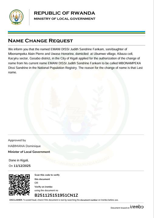 Uncategorized Notice requesting a change of name Editor December 11, 2025 1 min read Share on FacebookPost on XFollow usSave About The Author Editor See author's posts Continue Reading Previous: Empowering ability: How UWEZO’s SERUKA Mwana Club is transforming the lives of children with disabilities in Rwanda Leave a Reply Cancel replyYour email address will not be published. Required fields are marked *Comment * Name * Email * Website Save my name, email, and website in this browser for the next time I comment. Related Stories Empowering ability: How UWEZO’s SERUKA Mwana Club is transforming the lives of children with disabilities in Rwanda 3 min read Uncategorized Empowering ability: How UWEZO’s SERUKA Mwana Club is transforming the lives of children with disabilities in Rwanda October 23, 2025 RICTA Appreciates institutions that contributed to building and advancing Rwanda’s internet infrastructure 2 min read Uncategorized RICTA Appreciates institutions that contributed to building and advancing Rwanda’s internet infrastructure October 15, 2025 E-Health: Rwanda to Digitize All Health Facilities 2 min read Uncategorized E-Health: Rwanda to Digitize All Health Facilities October 14, 2025